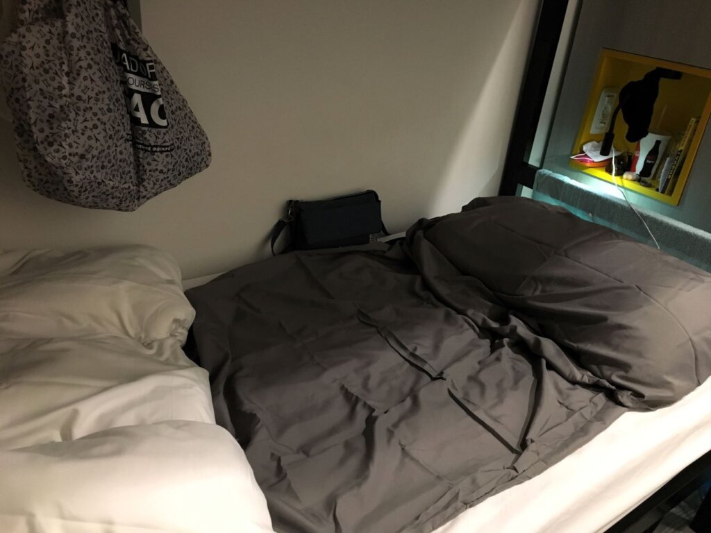 私のベッドwサンティアゴ巡礼をして以来、ベッドバグが怖くてシーツ式の寝袋を毎回持って行ってこの中に入って寝ていますw